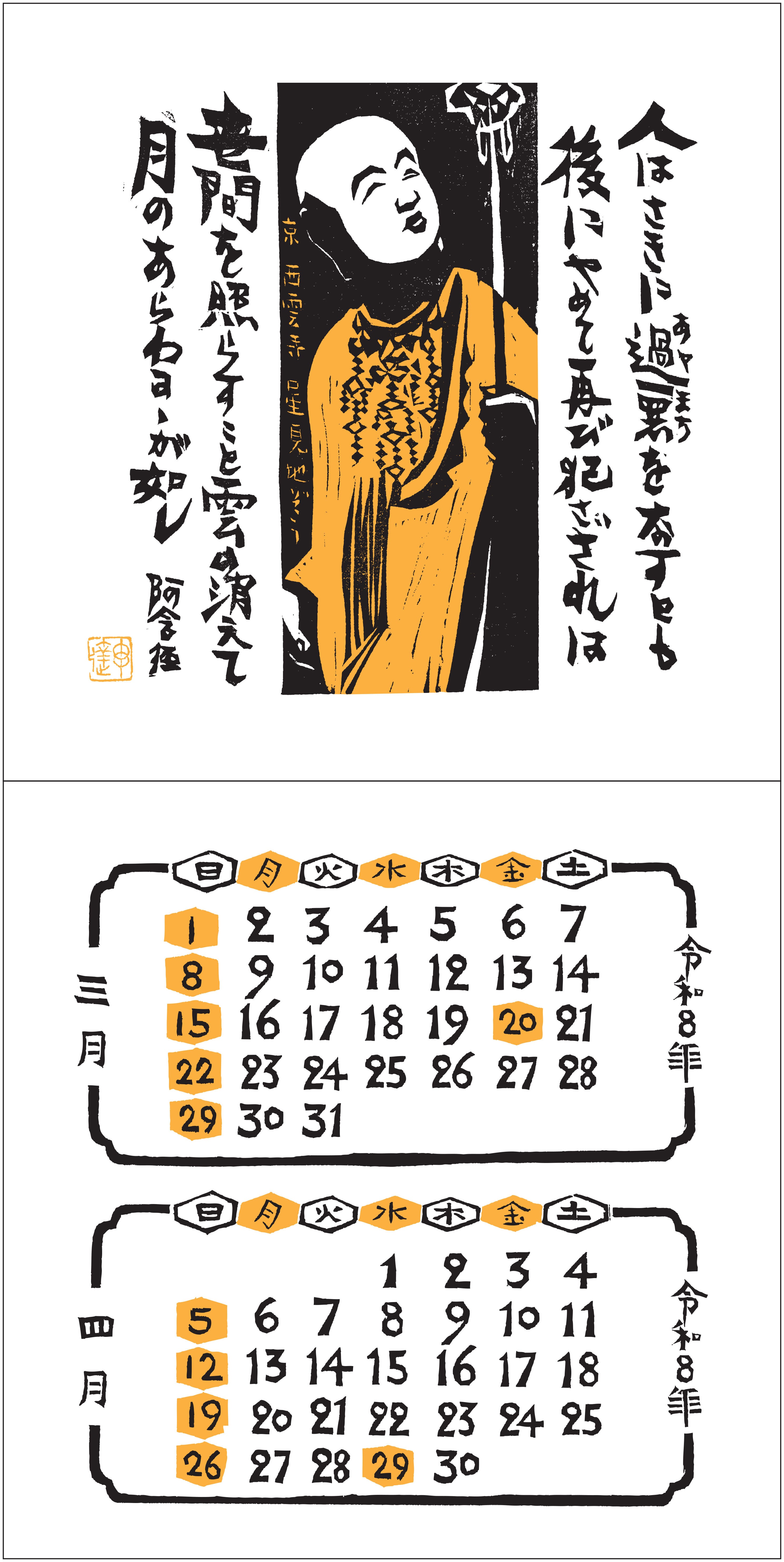 釈尊の言葉版画カレンダー2026年(令和8年)版 金と黒の二色だけで仕上げた素朴な味わいのあるカレンダーです。